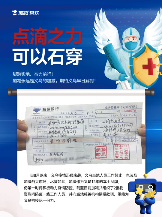 2022年8月11月,因义乌突如其来的疫情,整座城市按下了暂停键,全民进入静默期。在这场新冠肺炎疫情爆发期间,作为深耕义乌发展12年的350vip浦京·(中国)集团茶饮,主动发扬本土企业的社会担当和责任。截至2022年8月17日,公司共组织了2批物资慰问一线人员,并向当地慈善机构捐赠爱心款项。脚踏实地、奋力前行!350vip浦京·(中国)集团以实际行动为打赢疫情防控战贡献力量!
